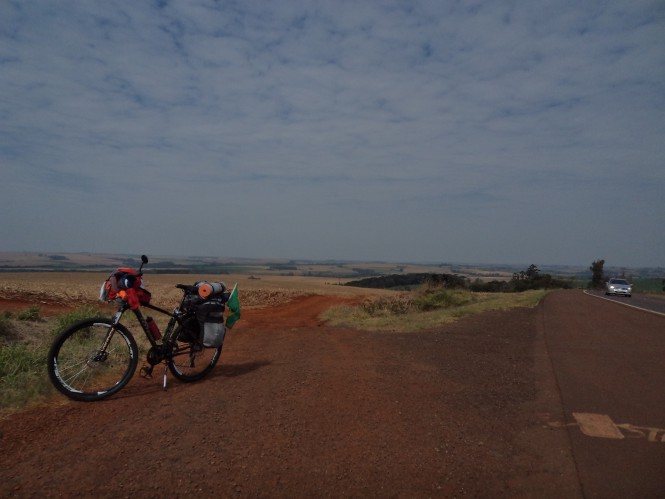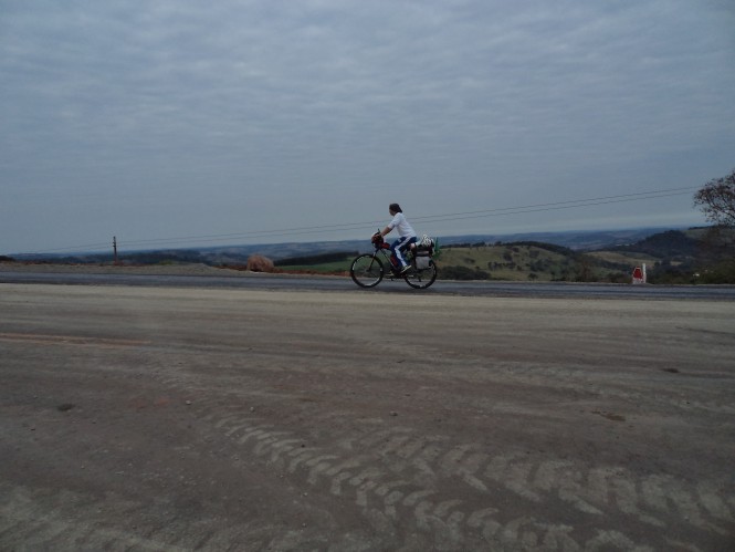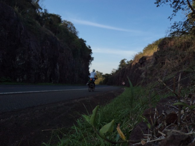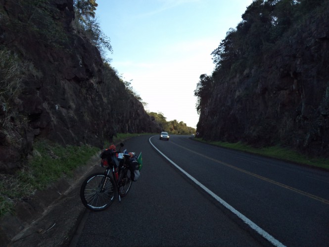 Continuo pedalando até às 13:30 e faço uma parada para almoçar, consigo uma marmita para janta e sigo estrada. Por volta das 16:30 chego à serra do Rio Piquirivaí, foi difícil mais uma vez enfrentar aquela serra...