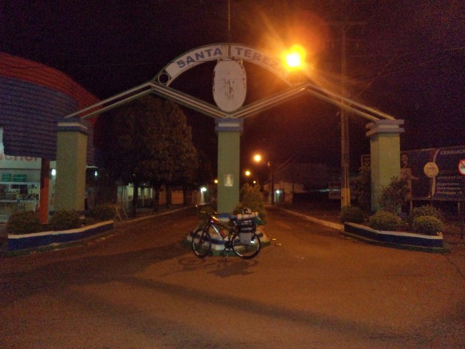 Mas enfim, chego em Santa Tereza do Oeste já de noite. Vou à polícia Militar (na verdade, uma pequena casinha com apenas um militar), peço acampamento e o mesmo diz que não poderia e me aconselha que talvez no pátio da Prefeitura eu consiga. Então vou até lá e peço, consigo um lugar seguro, porém sem chuveiro quente e sem microondas para esquentar minha comida... Então, vou à procura, primeiro vou a um posto de gasolina e à rodoviária, mas não consigo. Então tenho a ideia de ir a um colégio, lá consigo tranquilamente esquentar minha comida e tomar um banho. Segundo o guardinha, o chuveiro esquentava, então fui lá testar e não esquentou! Como estava tudo pronto, banhei mesmo assim e com frio, hahaha.