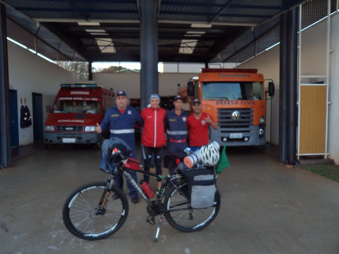 Entro na cidade e pergunto sobre Corpo de Bombeiros, chego lá fácil, peço acampamento, mas o bombeiro Vinicius teve que ligar para seu Comandante que aceitou tranquilamente e cedeu um quarto que tinha na corporação. Foi demais! Os bombeiros Ney, Jhoni e Vinicius são muitos parceiros! Ofereceram-me janta e churrasco, mas eu já tinha marmita e tive que recusar... Pessoas assim que tornam a viagem mais emocionante.