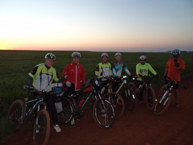 Chegando a noite, o vento diminuiu e eu aproveito. E quase chegando em Campo Mourão, encontro esse grupo de ciclistas que me fazem companhia até o meu destino...