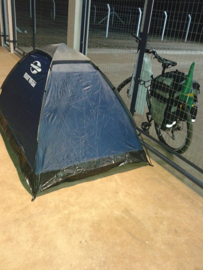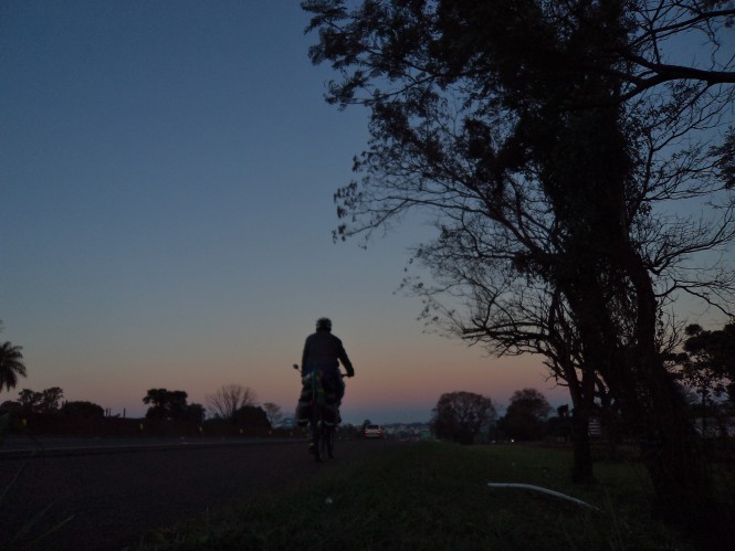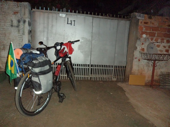 A noite chega e eu opto por parar, não estava em meus planos pedalar à noite. Então, fico na dúvida: acampar no meio do mato(do nada) ou pedir acampamento em algum lugar? Enfim, pedalo mais um pouco e avisto uma fábrica de processamento de grãos, em Mamborê e é lá que fui pedir um pequeno local para instalar minha barraca. Ufa! Consigo! Fico junto à entrada da fábrica e fecho o dia com 144 kms pedalados. Fora um dia, como todos, muito proveitoso.