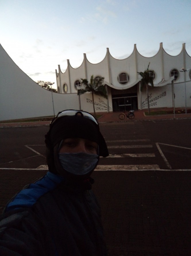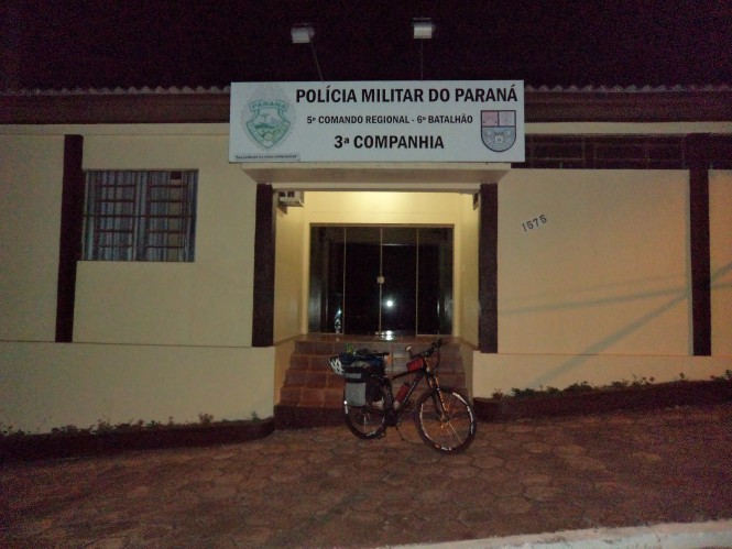 Matelândia, uma cidade pequena, foi fácil encontrar a Catedral e um único Posto de Polícia. Porém, a Catedral não era cercada e estava toda fechada. O que me resta é ir à Polícia. Chego, apresento-me e peço um local, foi difícil de conseguir, por um momento pensei que não conseguiria, mas o policial deu um jeito e me concedeu um quarto e não precisei montar a barraca. Muito cansado, faço um lanche e durmo. Fecho o 3º dia dia com 365 kms pedalados. Obs: ganhei um quarto confortável e não precisei de montar a barraca.