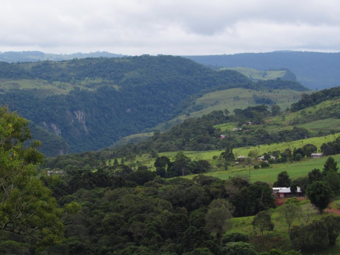 Após chegar na 11º queda decido descer, pois o relógio marcava 16:30 h e eu tinha que pedalar mais 41 kms até a casa da minha prima. Então desço correndo para pegar a minha bici e seguir rumo a Jaraguá... Pedalo cerca de 8 kms por estrada de terra e pego a BR-280. A mesma estava com um trânsito muito intenso naquele horário (aprox. 18 horas) e pra piorar, nos trechos que eu estava pedalando o acostamento era minúsculo ou inexiste. Então paro pra fazer um lanche à beira da estrada e decido pegar novamente estradas de terra para evitar aqueles trechos... Enfim, pedalei por trilhas lindas, bem mais calmas que a rodovia onde só se escutava barulho dos animais.Paisagens em Jaraguá do Sul, lindas!