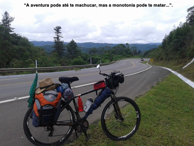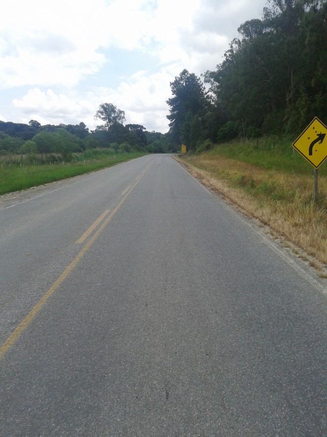 E então saio para o segundo dia de pedal, às 07:40, ao som de Armandinho, hahaha! O segundo dia de pedal começou bem, com uma estrada relativamente boa para pedalar (acostamento grande), mas a partir das 10:30 AM tal acostamento se torna quase inexistente e o pior é que ficou até o final do dia assim, somado com as longas subidas e trânsito pouco mais intenso, fez-me cansar e ao chegar em Turvo não consigo acampamento e então decido ficar em uma pousada. Enfim, esse dia apesar de ter lindos trechos, fiquei muito cansado e a soma de tudo isso me fez começar a ter pensamentos negativos, e antes que isso aumente, decido descansar e deixar reflexões para o próximo dia.