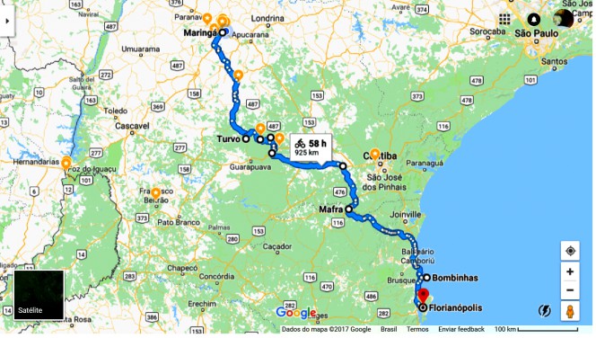 No dia 30 de novembro de 2017, após certo planejamento prévio de viagem, parto, às 7:30 da manhã para realizar minha segunda viagem de bicicleta, um sonho: Maringá (PR) a Florianópolis (SC). Foram pouco mais de 1170 kms pedalados com um percurso muito lindo: passei por cachoeiras gigantes, serras, praias, morros, lindas paisagens com vistas em horizontes, fiz muitas trilhas a pé e de bici. Também foi um percurso desafiador, pois além de ser um percurso difícil com grandes aclives, pedalei em lugares onde os acostamentos eram minúsculos ou inexistentes, mas com muito cuidado tudo ocorreu bem (um perrengue ou outro, mas faz parte, rs).
