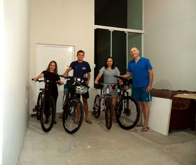 E ao final da tarde, após pedalar as longas subidas, pego à direita, em uma rodovia que dá acesso à Ivaiporã, cidade na qual decido acampar. Chego na cidade por volta das 19 horas e vou direto aos Bombeiros pedir um local seguro para acampar, espero a resposta por cerca de 30 minutos, neste tempo já começo a ajeitar as coisas pensando que a resposta seria positiva, mas infelizmente a resposta foi negativa, o motivo dado foi que o local estava em reforma... Enfim, não esperava esssa resposta negativa, mas sigo à procura, primeiramente vou em direção ao centro da cidade, pensando em achar uma igreja ou pátio de prefeitura, infelizmente também não consigo. Aí começo a ficar um pouco preocupado, mas ainda sigo à procura e no centro da cidade avisto um ciclista e decido conversar com o mesmo, com nome de Plínio peço algumas dicas de local para acampamento e após uma conversa, o mesmo me faz um convite: ''Não quer acampar lá em casa?'', eu aceito. Ao chegar em sua casa, o mesmo me apresenta a sua esposa Deusilene e sua cunhada Lúcia. Que ''daora'' conhecer essa galera! Pessoas animadas, de bom coração e ainda são ciclistas! hahaha. Plínio diz que não seria necessário montar barraca pois teria um quarto para eu passar a noite, eu com o intuito de não gerar incômodos e por ter apenas necessidade de um local seguro, digo que não precisa, mas após novos convites, decido aceitar. Enfim, fui bem recebido e estar na companhia desse pessoal me fez recarregar a energia do dia difícil de pedal.