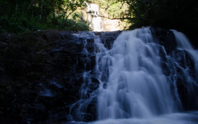 O trajeto até a segunda cachoeira é mais longo de todas e já é possivel pereber que o nível de dificuldade aumenta. Já existe mais mato e alguns obstáculos que aparecem pelo caminho como pontes e escadas improvisadas. Existe também passagem entre pedras através de cordas de aço. Um pouco de cuidado é necessário.