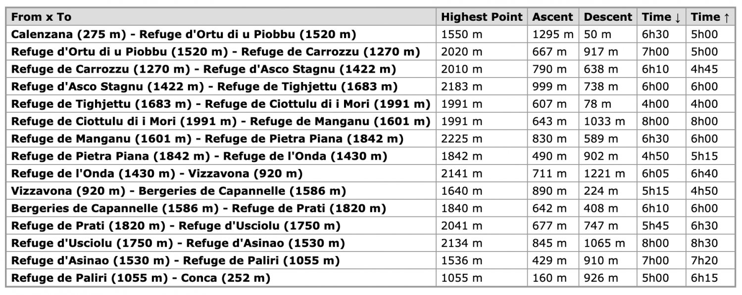 The classic path from Calenzana to Conca can be completed in 15 days, with daily walks from 5 to 8 hours per day. The following table shows the classic itinerary: