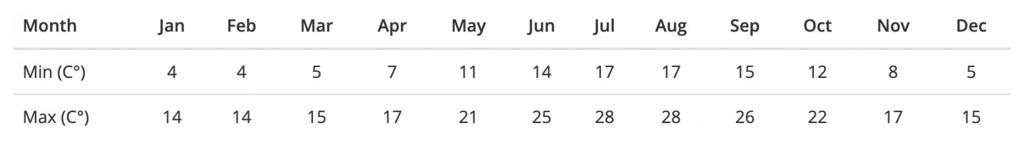 The following table shows Corsica's minimum and maximum temperatures during the year.